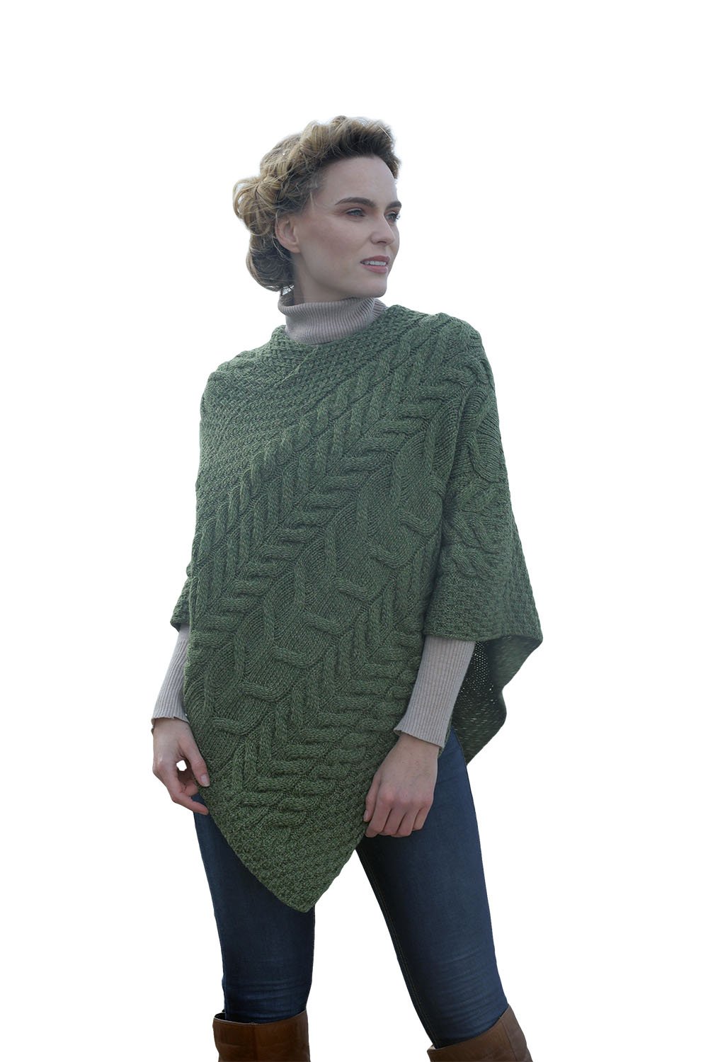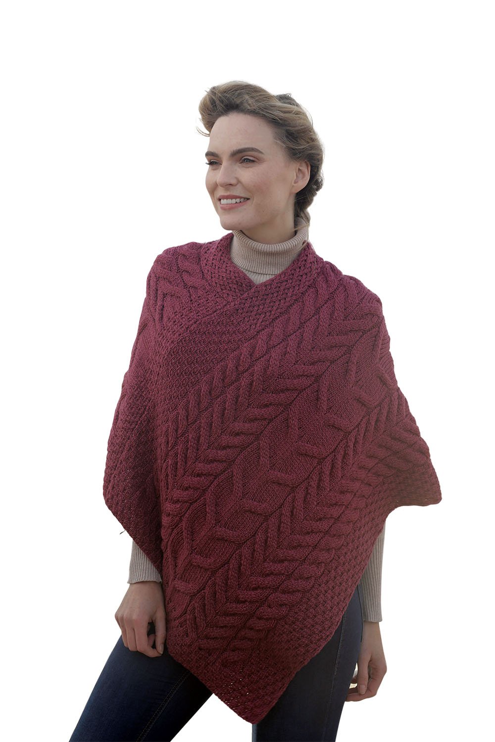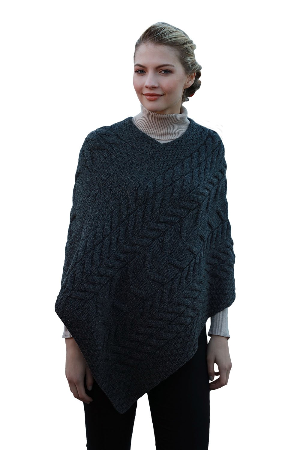 Aran Stitching – A chunky knit featuring alternating Aran cable rope and braided patterns gives this poncho great style, texture, and dimension. The diagonal display of these cable patterns also creates an eye-catching geometric effect